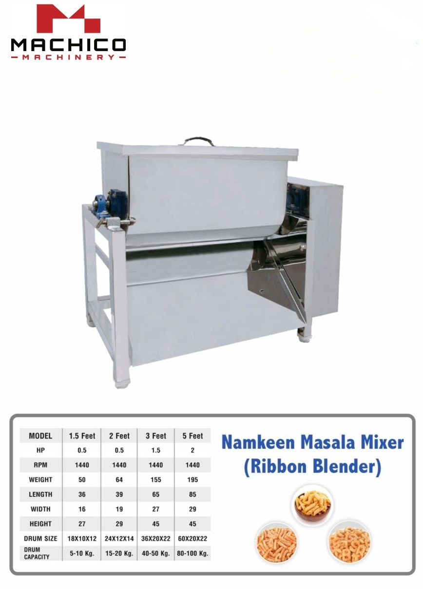 Mixing masala and namkeen manually is a labor-intensive task that often results in uneven blending and inconsistent taste. The 1.5 Feet Masala Mixer Machine is designed to solve that problem with precision and power. Operating at a fixed speed of 60 RPM, this machine features a ribbon-type mixing blade mounted on a sturdy shaft, ensuring that spices, seasonings, powders, and dry ingredients are blended uniformly and effectively. Fixed 60 RPM speed for optimal blending Ribbon blender for thorough and even mixing Strong and easy-to-clean stainless steel body Compact 1.5 feet size – perfect for small businesses Low maintenance and energy-efficient