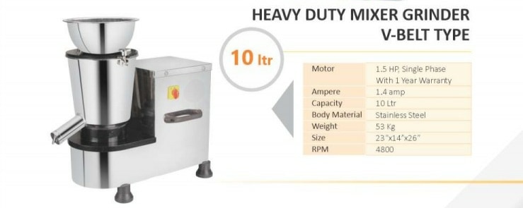 The 10 Litre V-Belt Mixer Grinder by Machico Machinery is a heavy-duty commercial grinding machine designed for bulk food preparation. Powered by a high-torque motor and a durable V-belt drive system, it ensures smooth, stable, and vibration-free grinding of vegetables, spices, chutneys, and gravies. With a 10-litre stainless steel jar, this mixer is ideal for medium to large-scale kitchens, delivering pulpy, uniform grinding with ease. Large 10 Litre Capacity – Perfect for bulk grinding in commercial kitchens. V-Belt Drive System – Reduces vibration, increases durability, and ensures smooth performance.