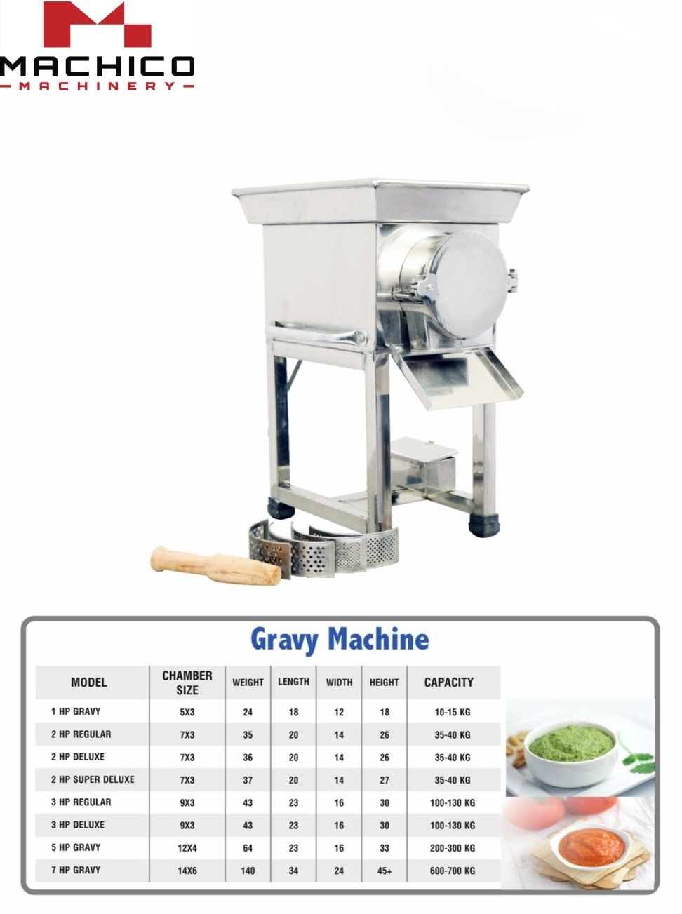 The 7 HP Gravy Machine is an industrial-strength wet grinder engineered for extremely high-volume food preparation. Designed for large-scale food processing units, central kitchens, catering services, and commercial mess operations, this machine delivers exceptional grinding performance for gravies, pastes, chutneys, and sauces. Equipped with a powerful 7 HP motor, it can handle tough, fibrous ingredients like onions, tomatoes, garlic, ginger, chilies, and whole spices with ease—ensuring a smooth, uniform texture in every batch. Its high-capacity output makes it the ideal solution for kitchens that demand speed, quality, and reliability at scale. High-torque 7 HP motor for maximum grinding efficiency Built for continuous, heavy-duty operation Food-grade stainless steel body for hygiene and durability Quick and uniform grinding of all wet ingredients