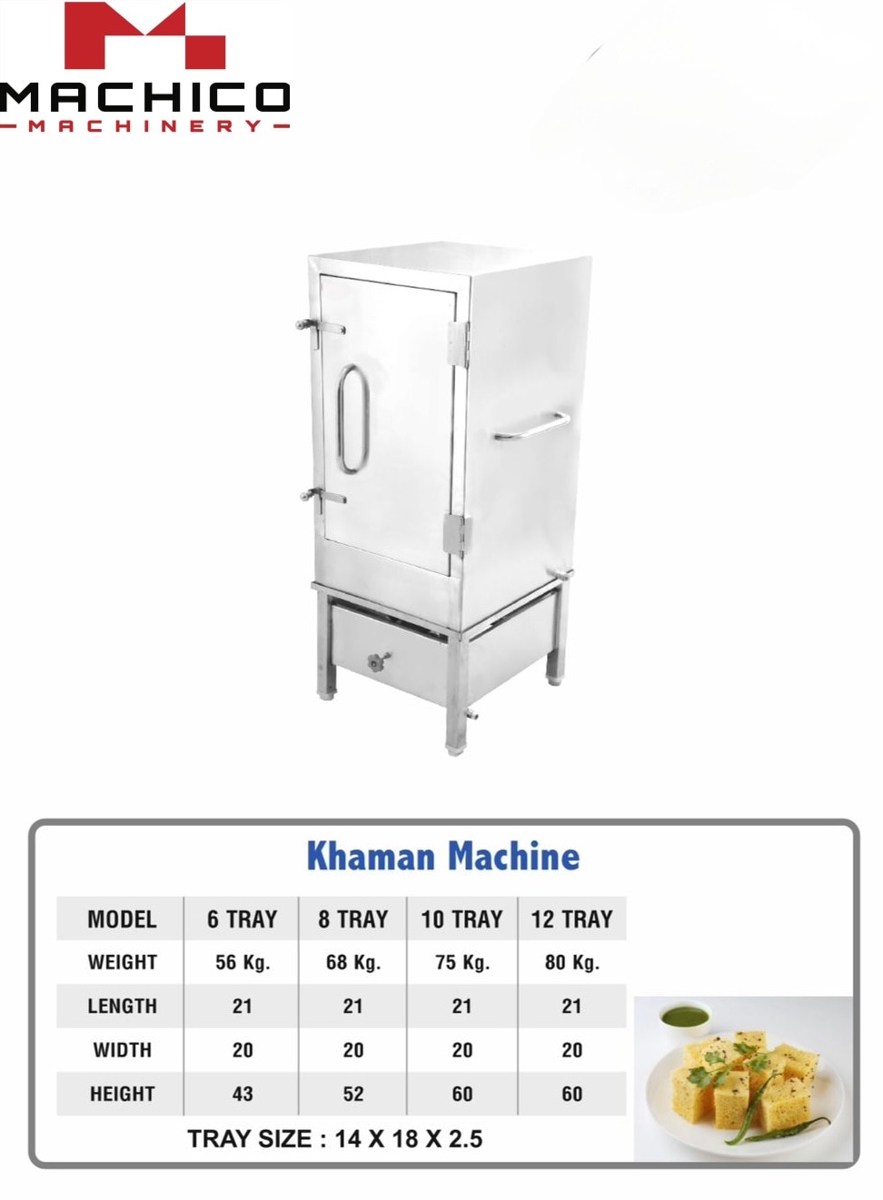 The Khaman Steamer by Machico Machinery is specially designed for preparing soft, spongy khaman in bulk with perfect consistency. Made from high-quality stainless steel, this machine is ideal for sweet shops, snack centers, and commercial kitchens. Available in 6 Tray and 10 Tray models, it meets both medium and large-scale cooking needs. 6 Tray Khaman Steamer – Perfect for medium-volume production in sweet shops and food stalls. 10 Tray Khaman Steamer – Ideal for high-demand kitchens, catering services, and bulk orders.